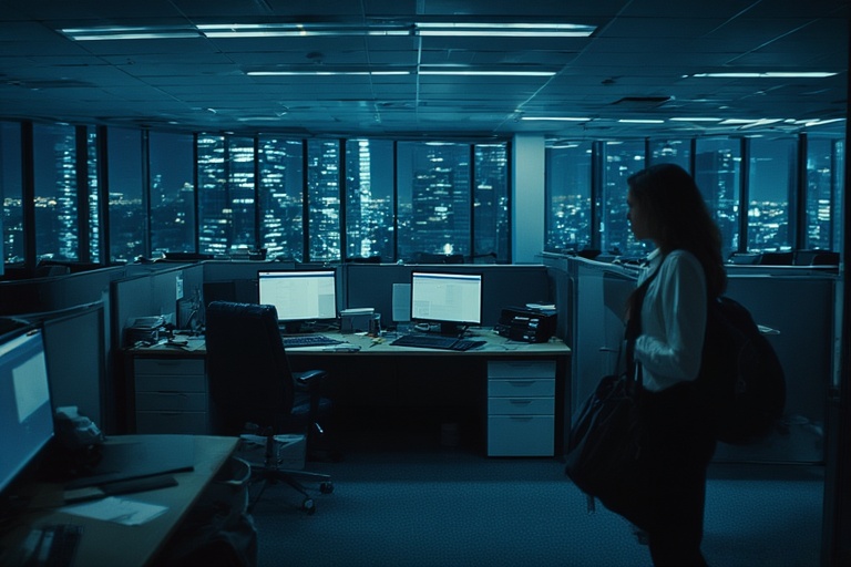 Saat berjalan di koridor ruangannya, terasa sangat sepi, dan ia baru menyadari bahwa hanya ia yang bekerja lembur disini, dan ia memencet tombol turun di liftnya, saat pintu lift terbuka di lobby, suasana sudah sangat berbeda dengan yang dilihat sebelumya, sepi sekali, hanya terlihat dipojok meja security seorang security yang tertidur sambil menaruh kepalanya di meja.