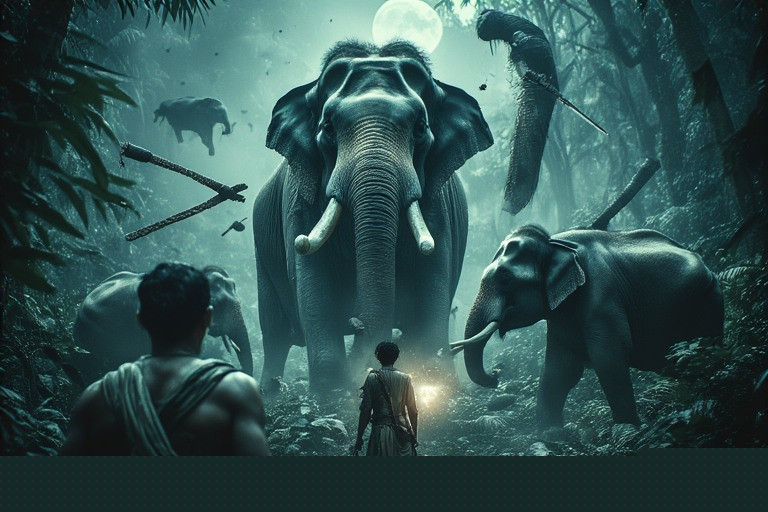 Sesampainya di tempat gerombolan gajah, Bujang Buta dihadang oleh sejumlah gajah, termasuk di antaranya Raja Gajah yang menawan sang Putri. Tanpa berpikir panjang, Bujang Buta pun mengeluarkan ketiga senjatanya. Setelah berdoa kepada Tuhan, ia mulai memusatkan perhatiannya pada ketiga senjata tersebut. Tak berapa lama, tiba-tiba terap itu terbang ke arah gerombolan gajah itu lalu melilit mereka. Setelah gajah-gajah tersebut terikat, penukul dan keris pun ikut meluncur memukul dan menikam gerombolan gajah tersebut hingga mati bergelimpangan.