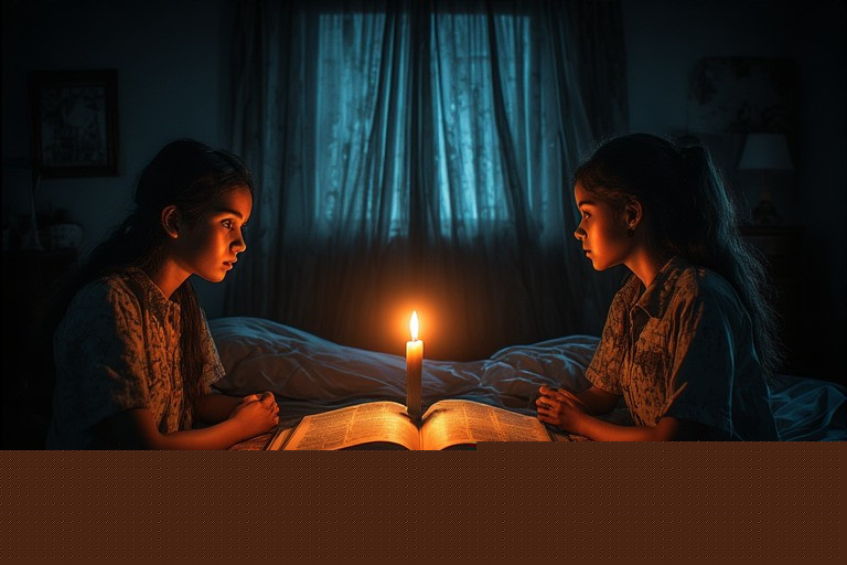 Mengikuti seluruh petunjuk yang ada di buku itu, mereka menutup jendela dan menarik tirainya sehingga seluruh ruangan itu benar-benar gelap. Di tengah-tengah kamar tidurnya, Anezka telah menyiapkan sebuah meja kayu kecil. Di sana, dia menaruh sebuah lilin kecil yang menyala, dan Klaudie menaruh buku itu di meja. Kedua gadis itu lalu duduk saling berhadapan dan berpegangan tangan satu sama lain. Menatap buku itu, mereka mulai membacanya bersama.