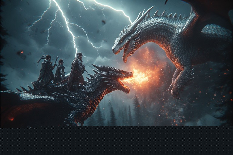 Setelah dekat, salah satu naga hitam menyemburkan api ke arah sayap kiri naga putih. Dengan gesit naga putih menghindar. Akan tetapi, Naga hitam tak putus asa, ia kembali menyemburkan api, kali ini ke arah sayap kanan naga putih. Sementara naga putih lagi-lagi berhasil menghindar diiringi dengan jeritan para peri elf yang menunggangi punggungnya.
