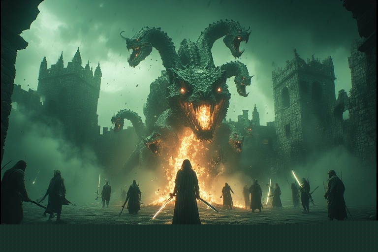 Sebuah nyala api putih menyambar tunggul leher Hydra sebelum kepala baru sempat tumbuh. Nyala api yang sama juga menyambar potongan kepala Hydra yang tergeletak di dekat kaki Elwood. Monster Hydra meraung keras, tubuhnya terhuyung tak tentu arah. Beberapa saat kemudian makhluk itu roboh menghantam salah satu sisi benteng. Namun sepersekian detik kemudian, monster itu bangkit lagi.