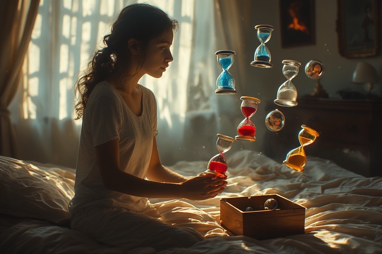 Kubalikkan badanku dan terpaku melihat sebuah kotak di samping tempat tidurku. Aku meraih kotak itu dan membukanya. Terdapat beberapa jam pasir dengan waktu yang berbeda-beda. Tapi yang lebih anehnya kotak itu terbagi dua. Di bagian atas seluruh jam pasir berwarna merah. Sedangkan yang bawah jam pasirnya berwarna biru. Kuraih jam pasir berwarna biru. “ini berapa menit ya?” kubalikkan jam pasir itu dan…