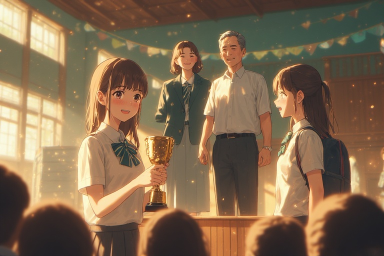 Beberapa saat kemudian, kami dipanggil untuk naik ke panggung untuk menerima piala. Semua orangtua siswa juga dipanggil untuk mendampingi putra-putrinya. Orangtuaku pun dengan perasaan bangga saat menuju ke panggung. Dan Aku terharu saat melihat kedua orangtua Dewi dengan bergandengan tangan menuju ke arah Dewi. Sepertinya mereka sudah rujuk kembali. Melihat ekspresi Dewi, kelihatannya dia tidak begitu yakin dengan kenyataan yang dia hadapi.