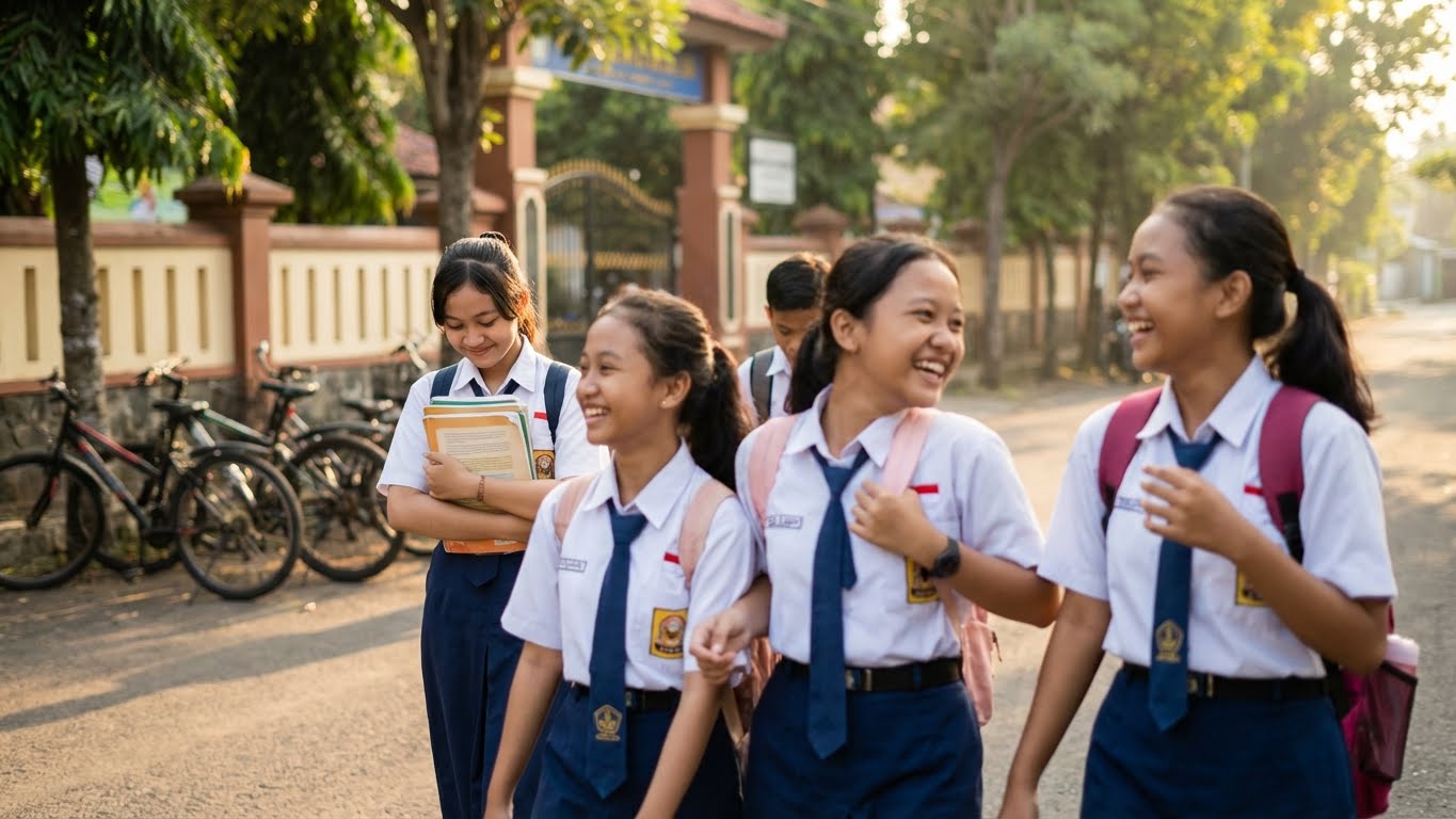 Selama tiga puluh menit mengendarai sepeda ke sekolah, akhirnya kami sampai juga. Kami memarkir sepeda di samping sekolah yang berdekatan dengan kantin tempat kami jajan atau sarapan setiap pagi jika tidak sempat sarapan di rumah sebelum berangkat ke sekolah.