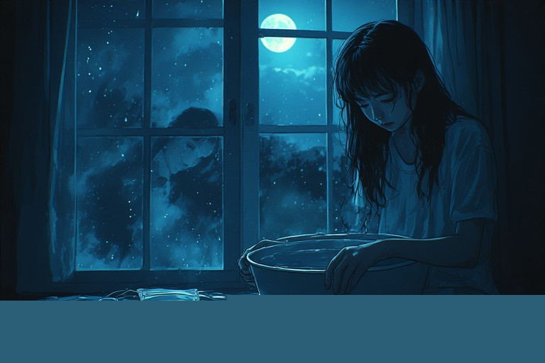 Gadis itu terkejut hingga ia menjerit tanpa sengaja. Pada saat yang sama, mata pisau cukur terlepas dari mulutnya lalu jatuh ke dalam baskom. Air berubah menjadi merah pekat seperti darah. Gadis itu melompat mundur dengan ketakutan sambil gemetar menatap baskomnya.