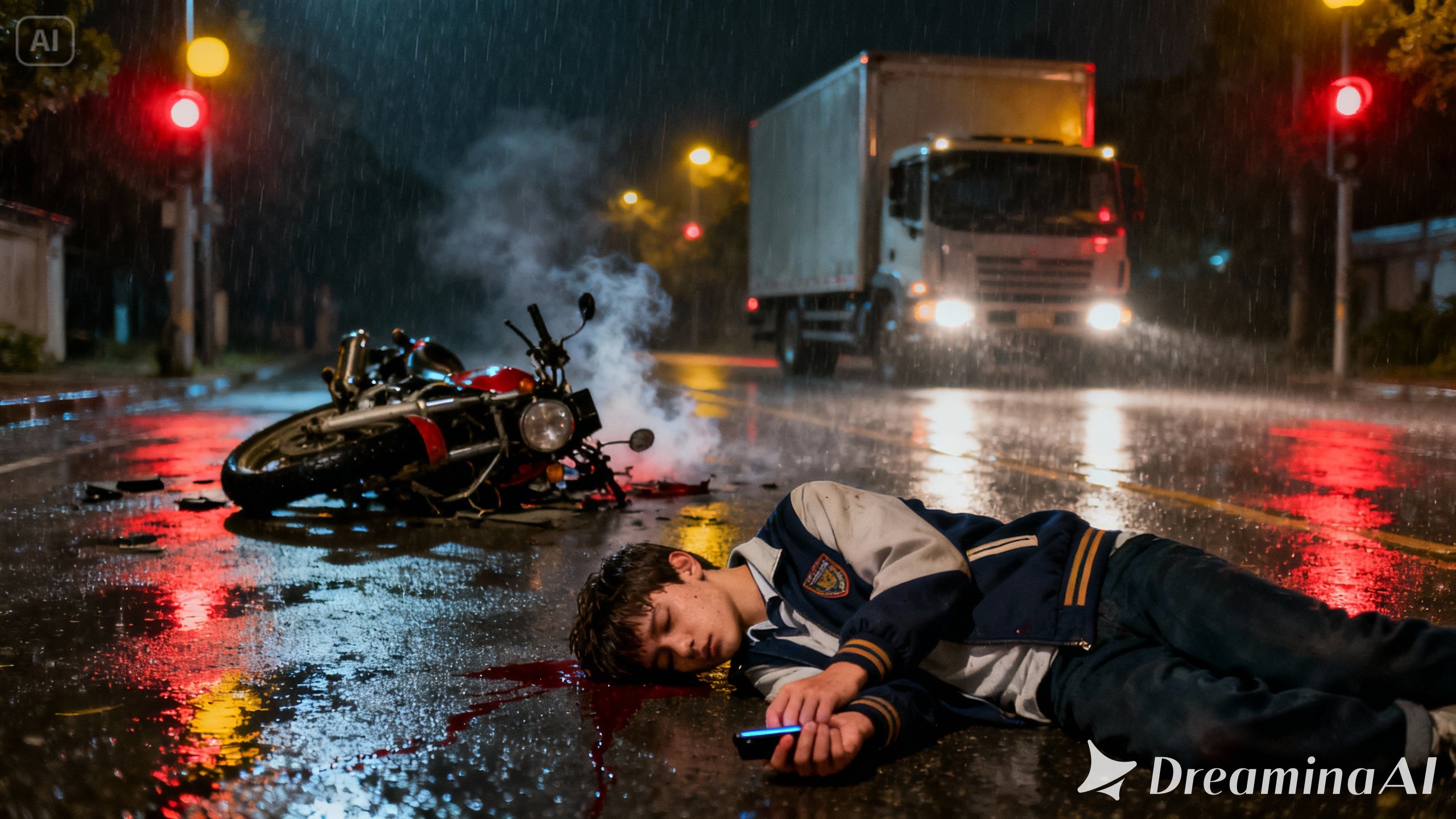 Aku segera berlari dan menaiki sepeda motorku. Aku tak kuasa menahan tangis yang telah kubendung sedari tadi. Aku cengeng. Aku memang sangat cengeng. Aku hanya melamun dan pandanganku kosong. Hingga tak kusadari aku menerobos lampu merah dan ada truk melintas. “BRUUKK!!” Aku menghantam truk tersebut. Pandanganku menggelap dan aku tidak sadar.